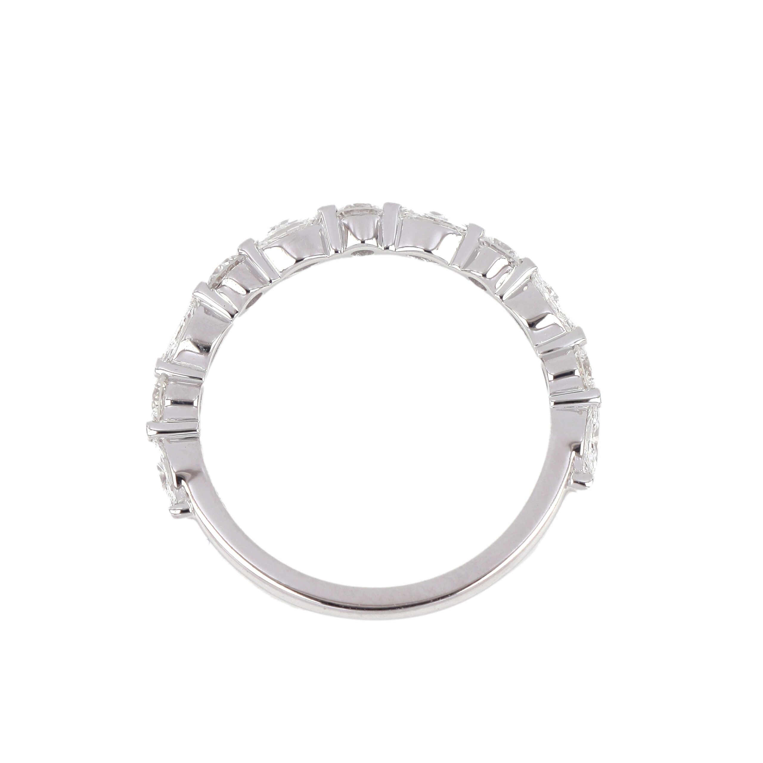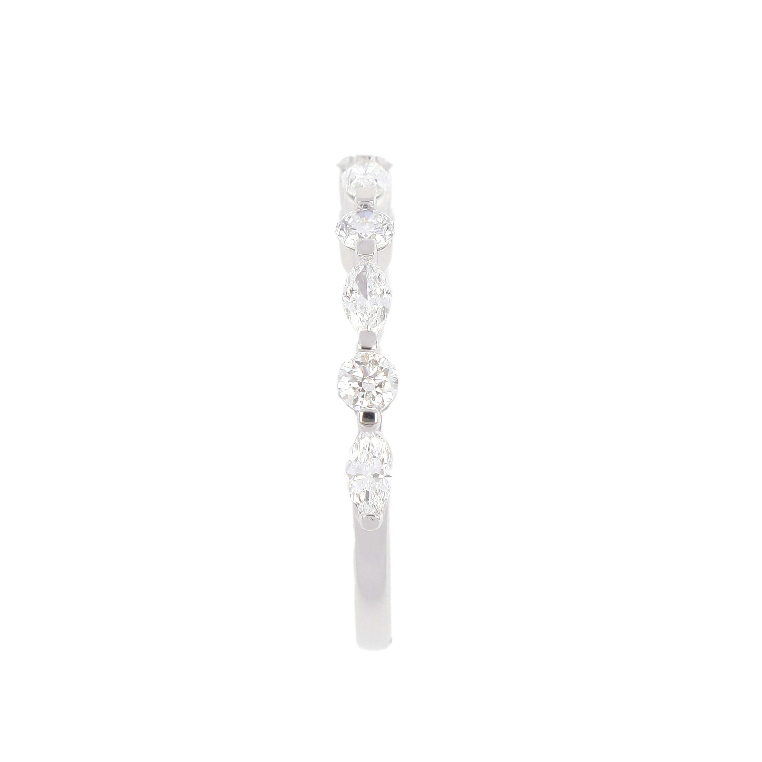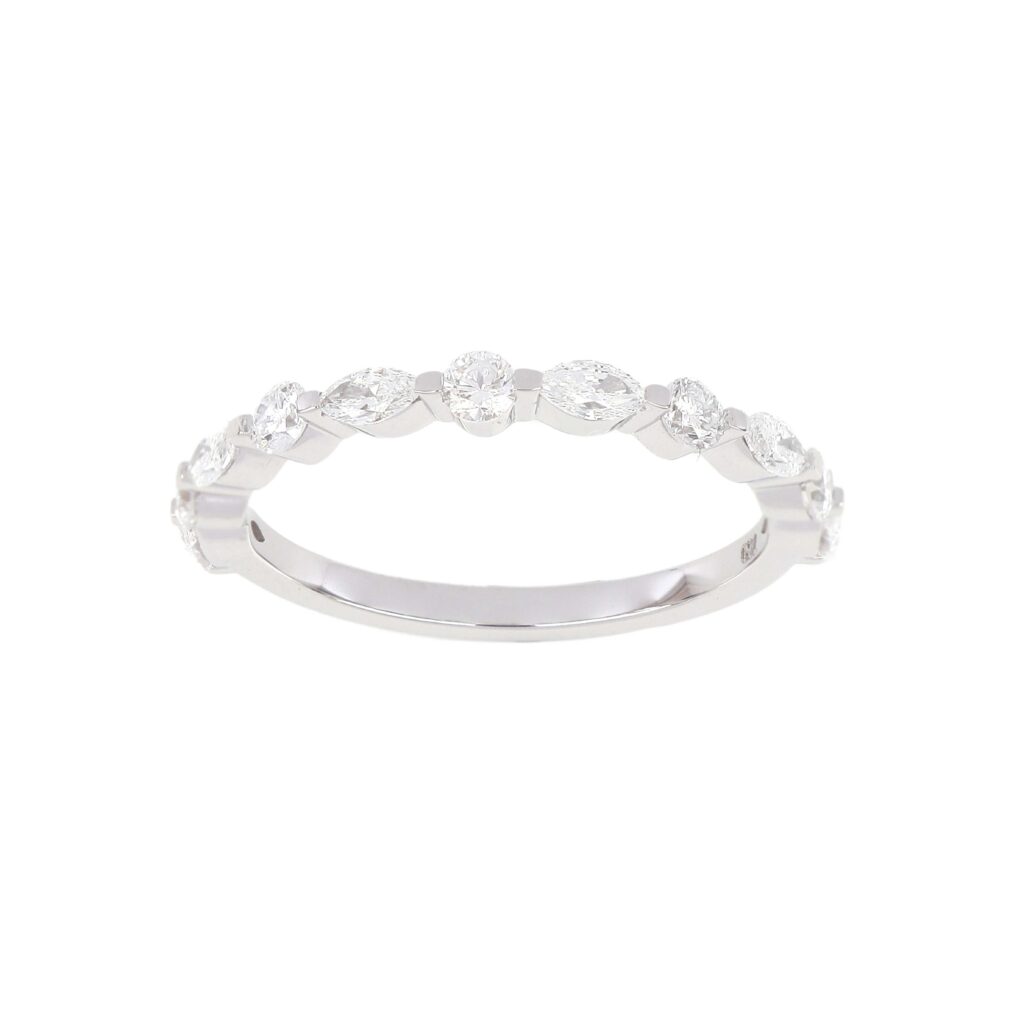 A chic design that plays with shape and light, this band features a pattern of alternating marquise and round-cut diamonds set along a slender band. The clean silhouette and modern symmetry make it ideal for stacking or standalone wear. Sophisticated yet playful, it offers a contemporary twist on classic diamond bands.