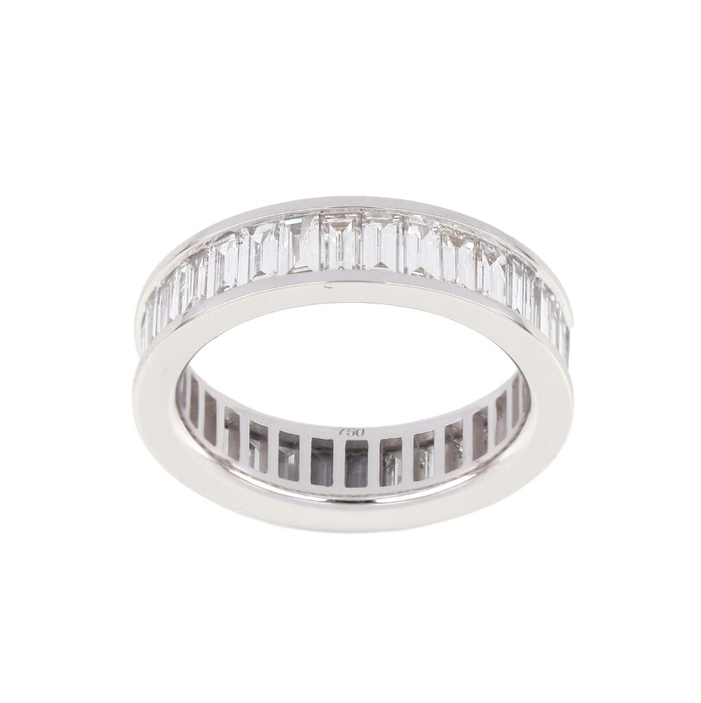 Discover the refined brilliance of this Baguette Eternity Ring, a striking blend of modern elegance and timeless design. Crafted in luminous 18K white gold, this ring features a continuous row of baguette-cut diamonds, meticulously set in a channel that wraps seamlessly around the band.