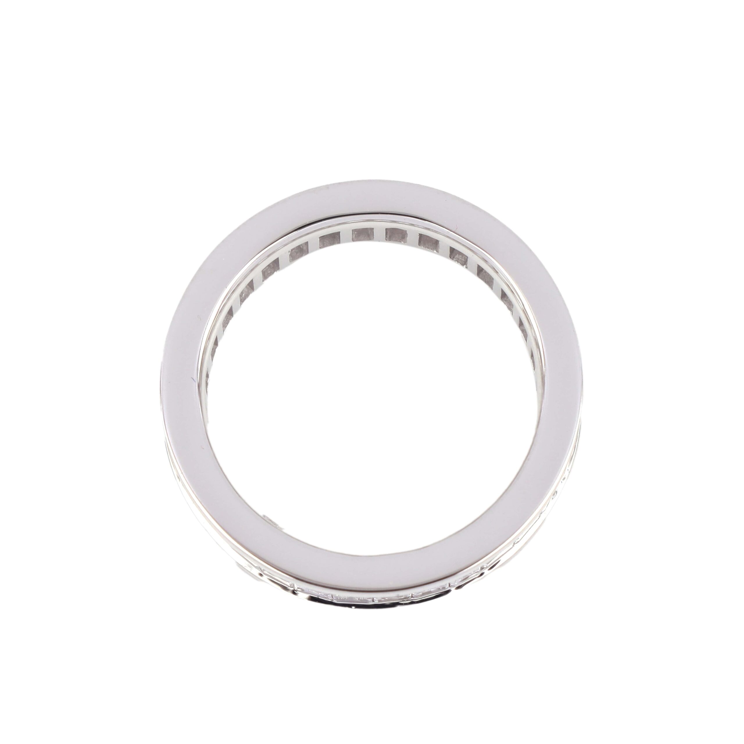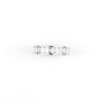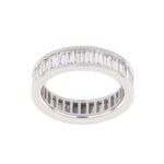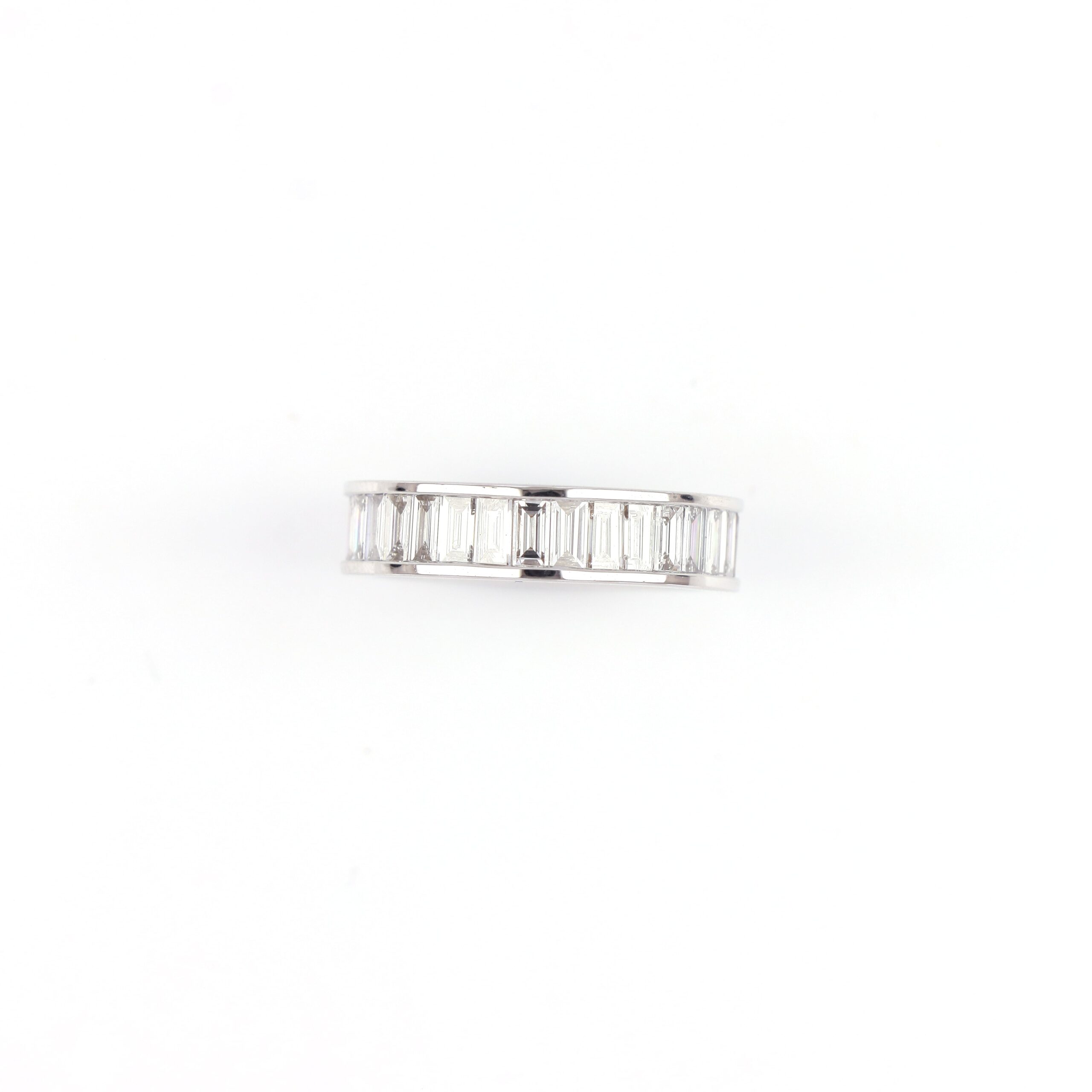 The clean lines and mirror-like finish of the white gold highlight the geometric precision and clarity of each stone. With its substantial profile and contemporary appeal, this piece is ideal as a wedding band, anniversary ring, or standalone statement of everlasting love.