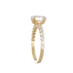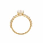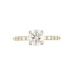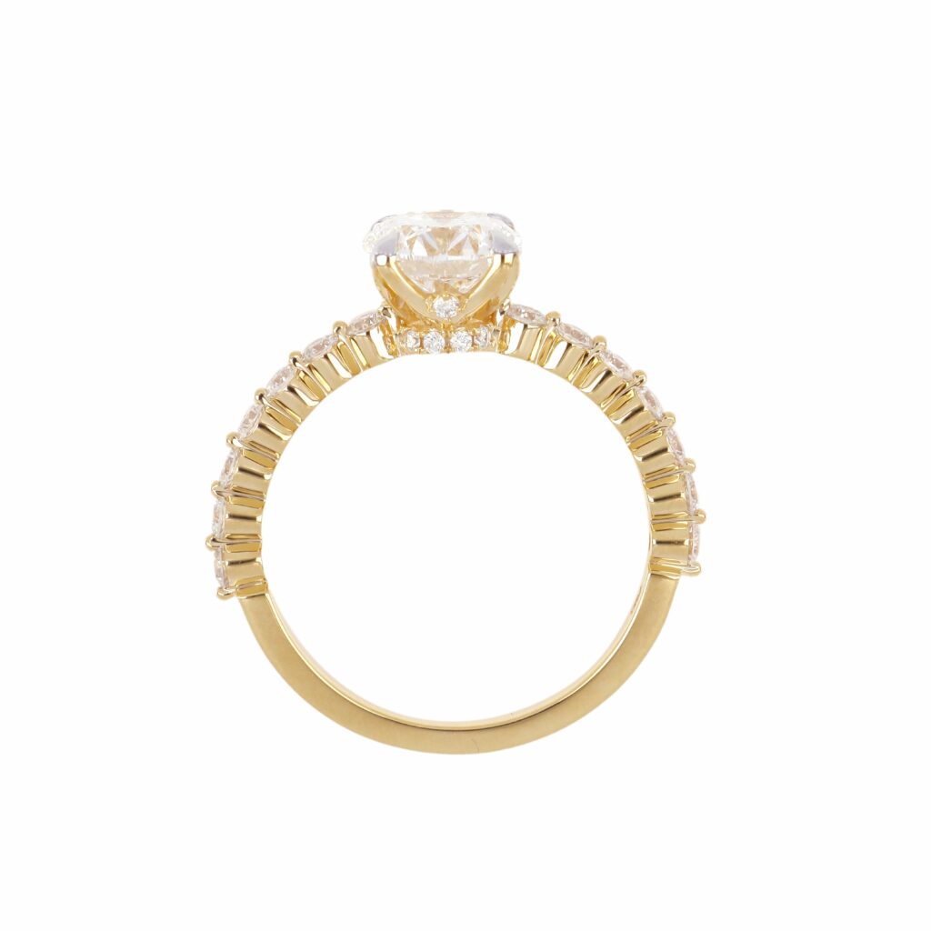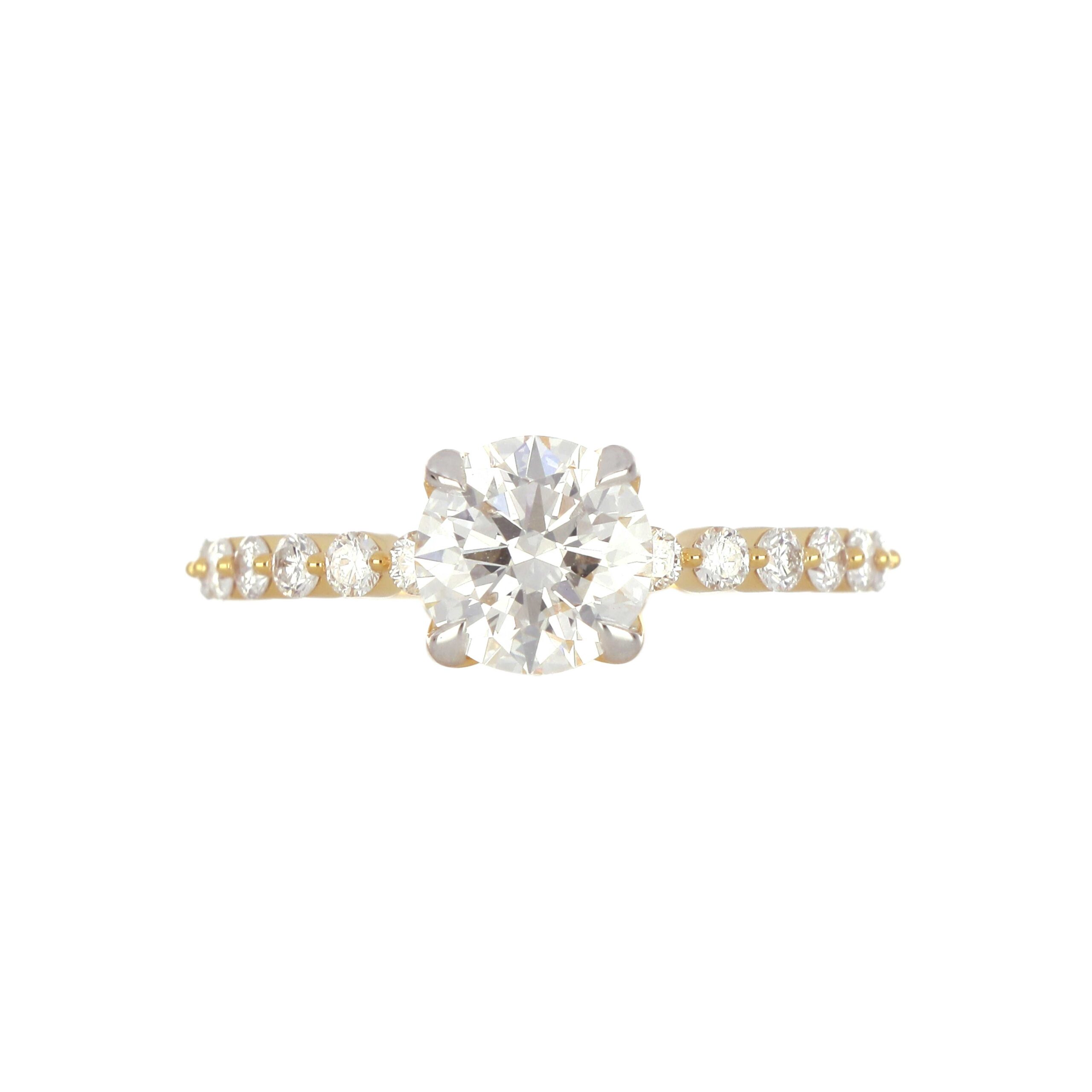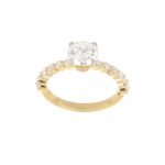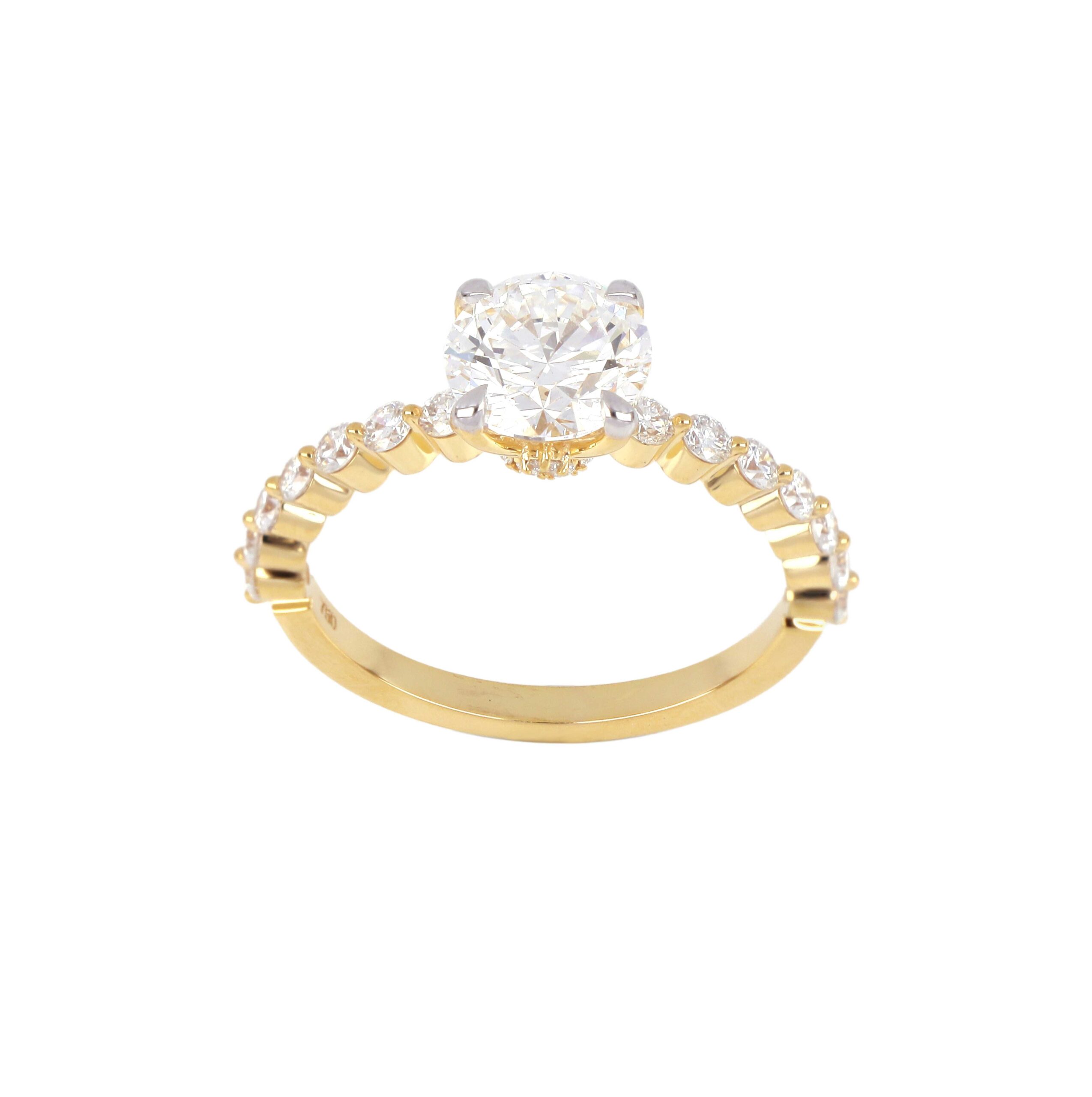 Exuding classic charm, this yellow gold ring is adorned with dazzling diamonds set along the band, creating a brilliant pathway to the sparkling round-cut center stone. Perfect for marking life’s most precious moments, this ring combines warmth and radiance in one breathtaking design.
