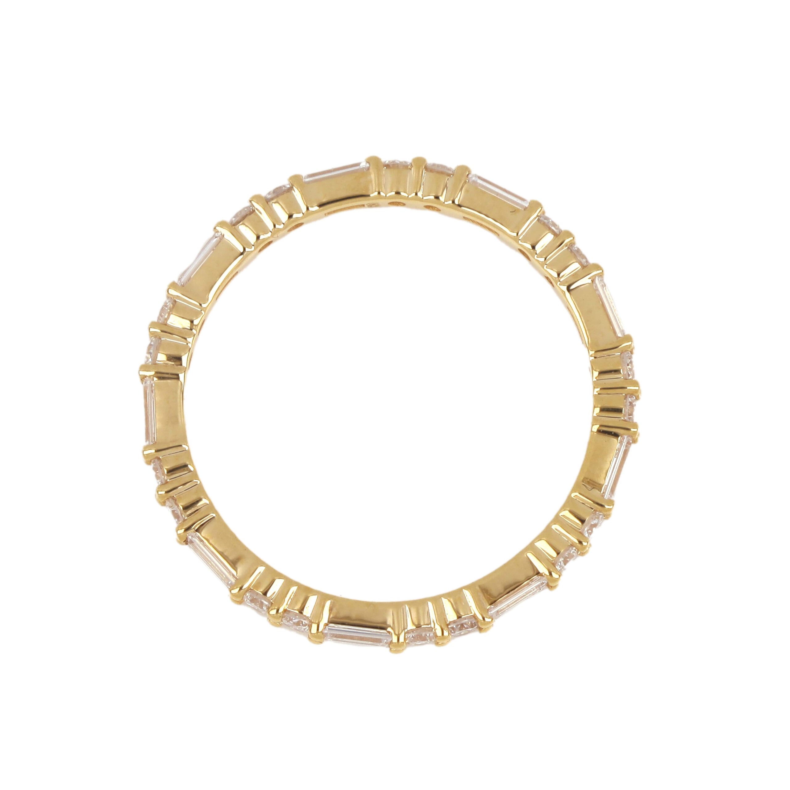 Add a touch of refined elegance to your jewelry collection with this Delicate Diamond Band, crafted in luxurious 18K yellow gold. Designed with alternating round-cut and baguette-cut diamonds, this eternity ring brings a balanced mix of sparkle and sophistication.