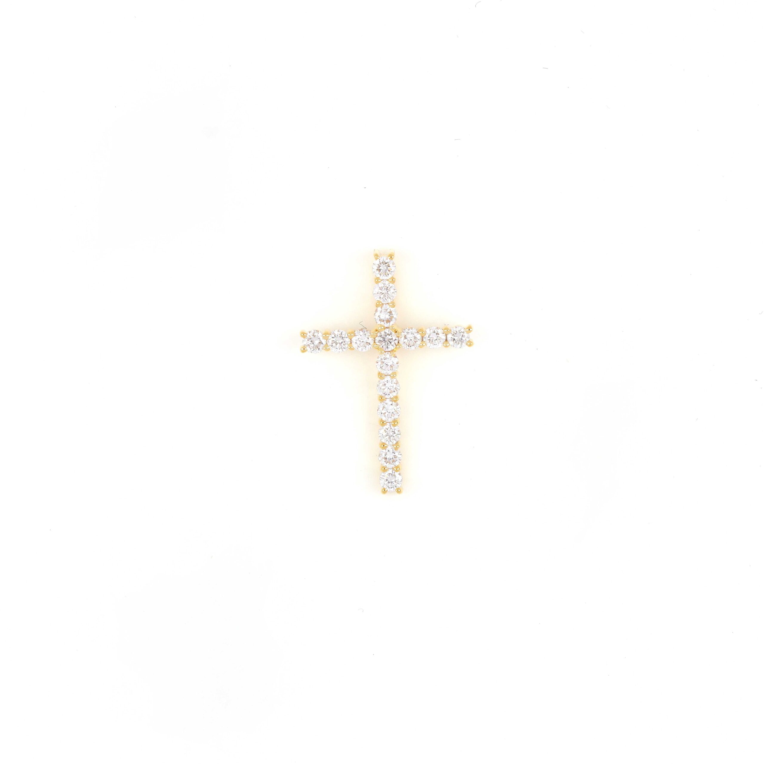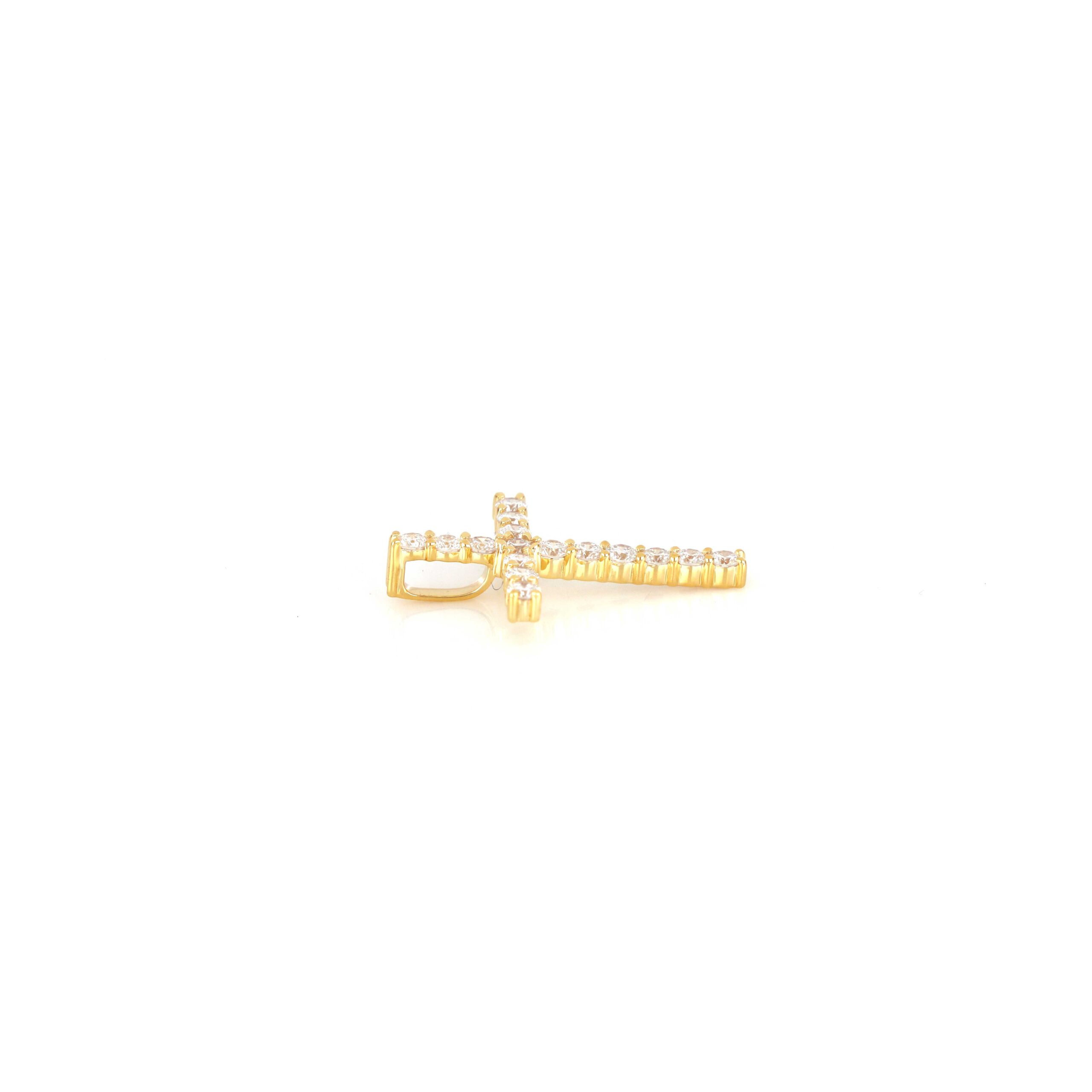 A graceful expression of devotion and beauty, this gold cross Pendants is adorned with brilliant round diamonds that shimmer with every move. Its timeless silhouette makes it a versatile and heartfelt piece, whether worn solo or layered. A radiant addition to any jewelry collection.