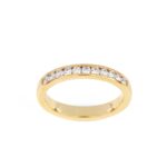 A harmonious blend of warmth and sparkle, this yellow gold ring features a row of precisely set round-cut diamonds. Its clean, channel setting gives it a streamlined, polished appearance. Ideal as a wedding band, anniversary gift, or stacking piece, it brings classic luxury to any occasion.