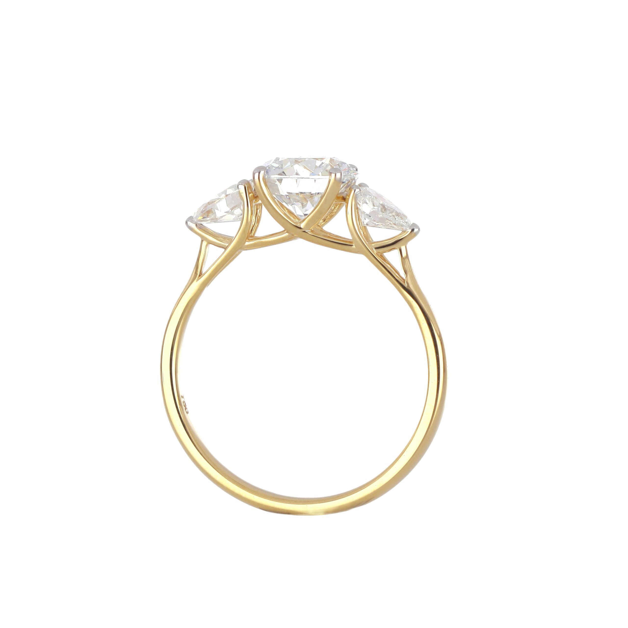 Simple yet meaningful, this three-stone ring is set in rich yellow gold and showcases a central round diamond complemented by two side stones. Its airy, modern setting enhances the natural beauty of the diamonds. A refined piece that tells a love story in every glance.