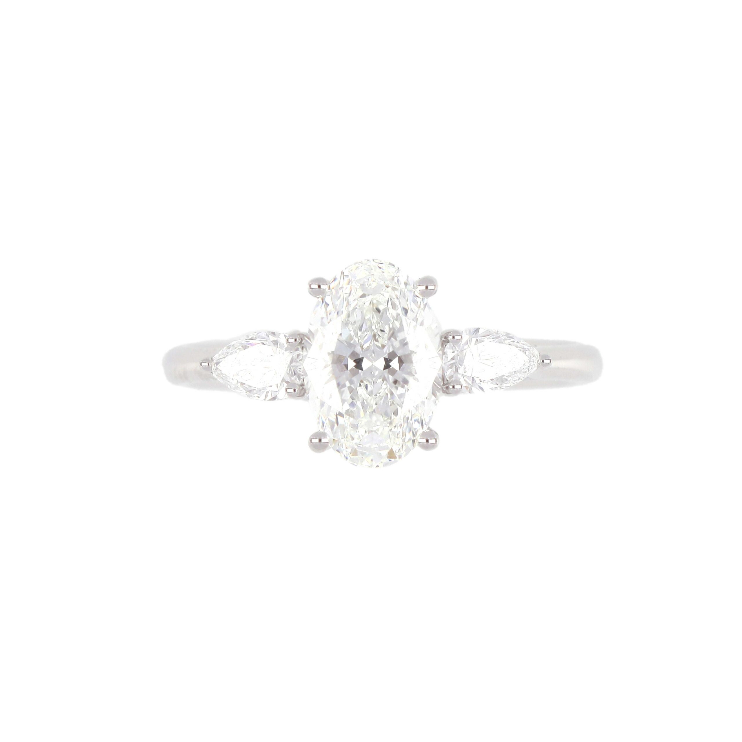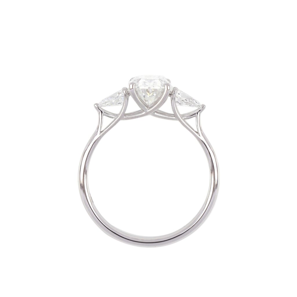 This three-stone ring combines an elegant oval center stone with two pear-cut diamonds, offering a unique and balanced silhouette. A meaningful design that symbolizes your past, present, and future—perfect for engagements or milestone moments.