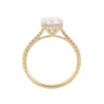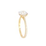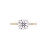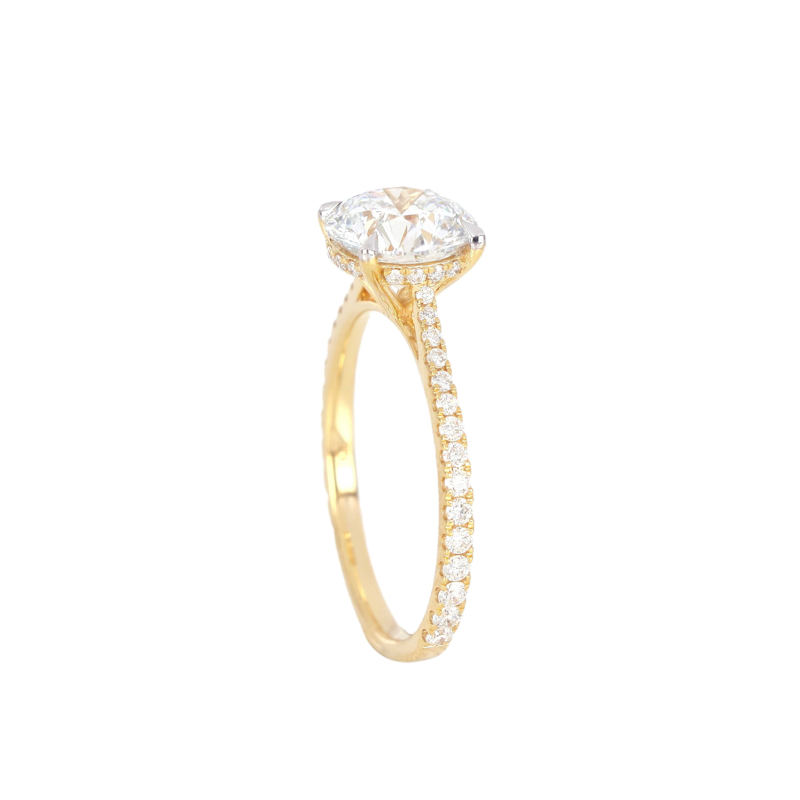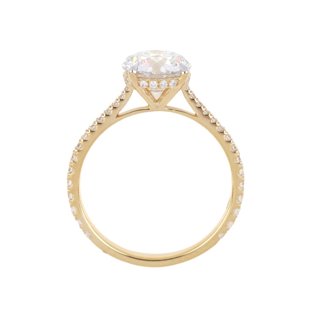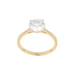 Delicate yet striking, this yellow gold ring showcases a pave diamond band that sparkles with every movement. The prominent round center stone is expertly set to command attention, making it the ideal piece for engagements or special celebrations.