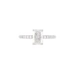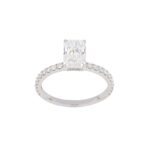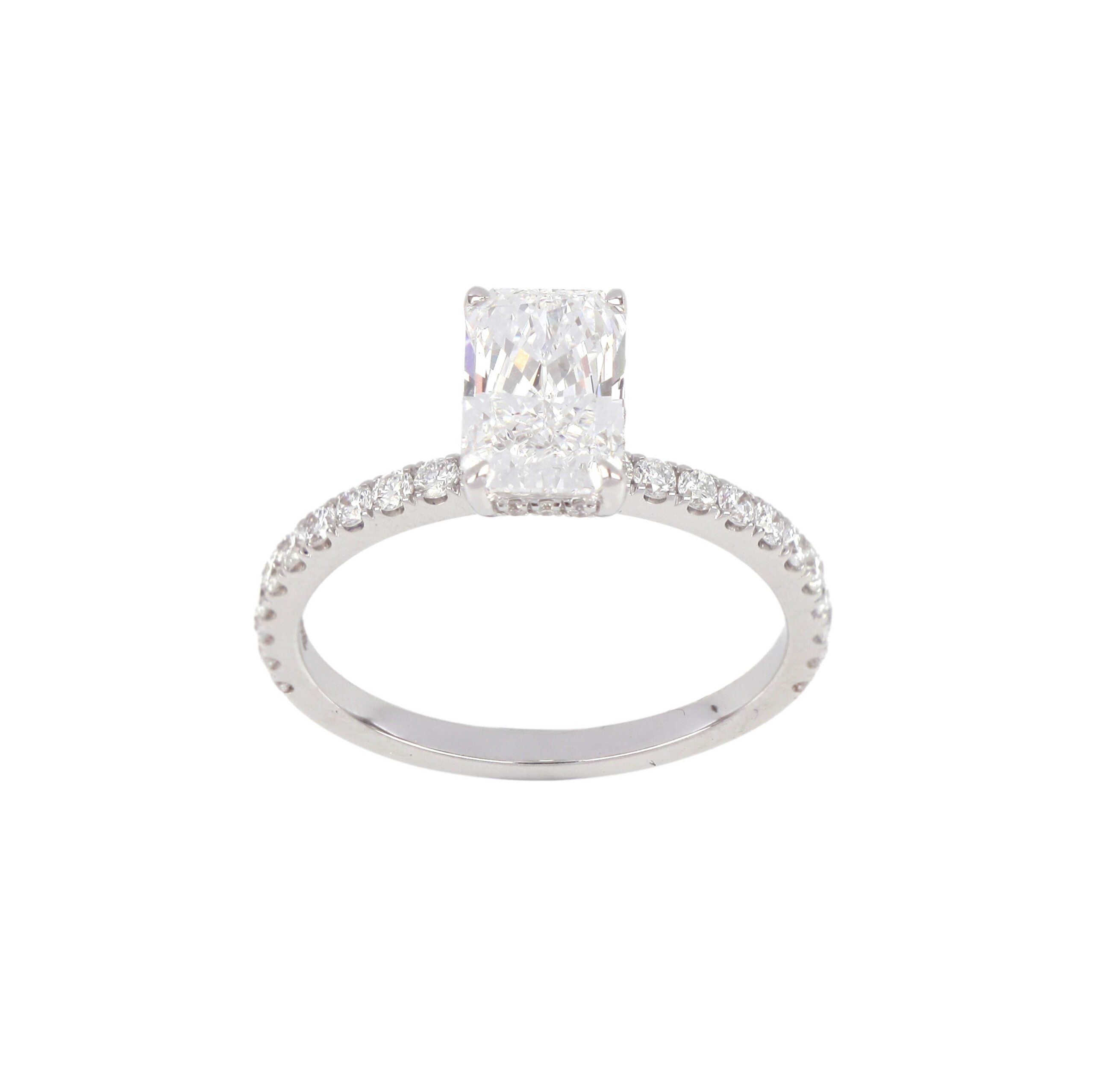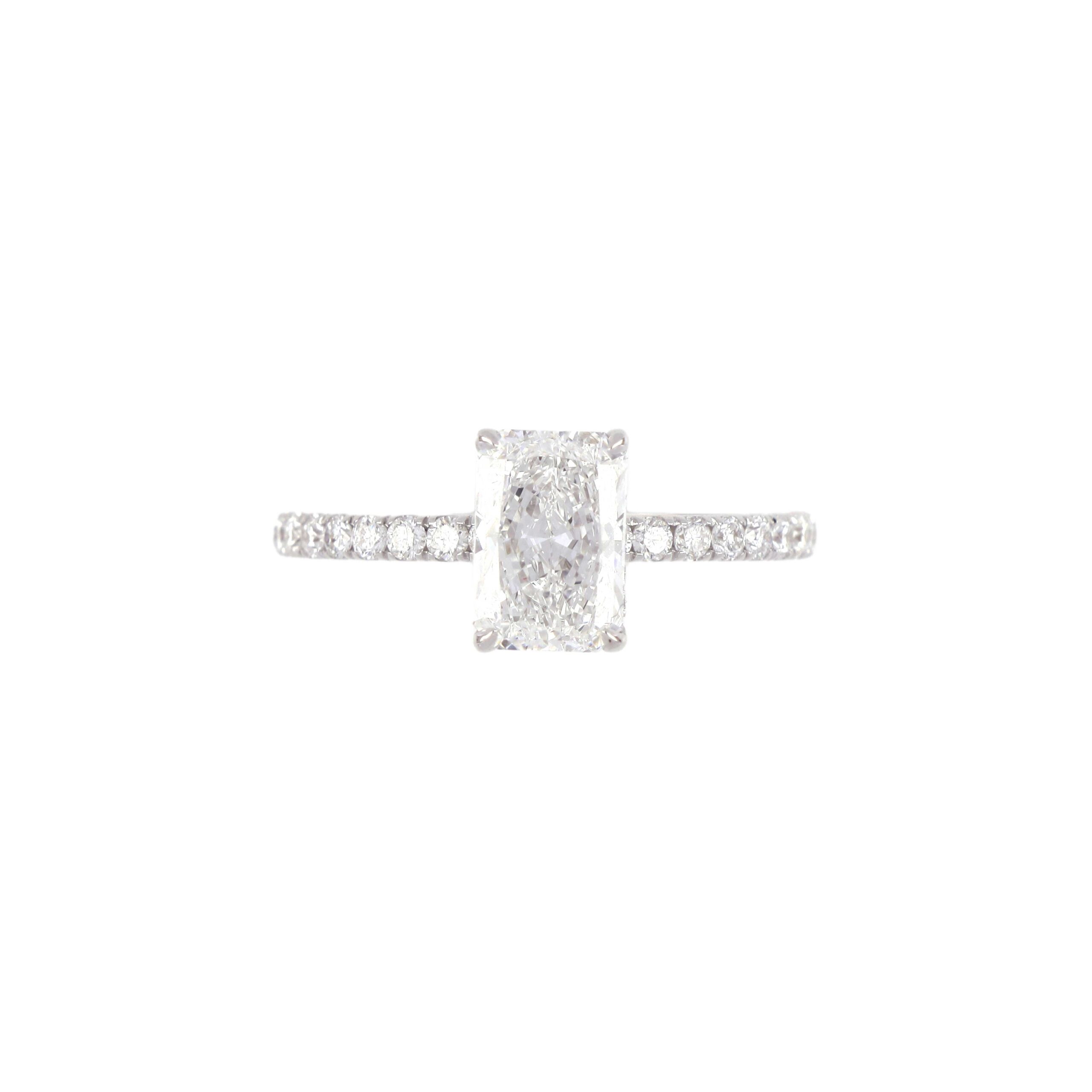 Radiant-cut diamond with pave band.