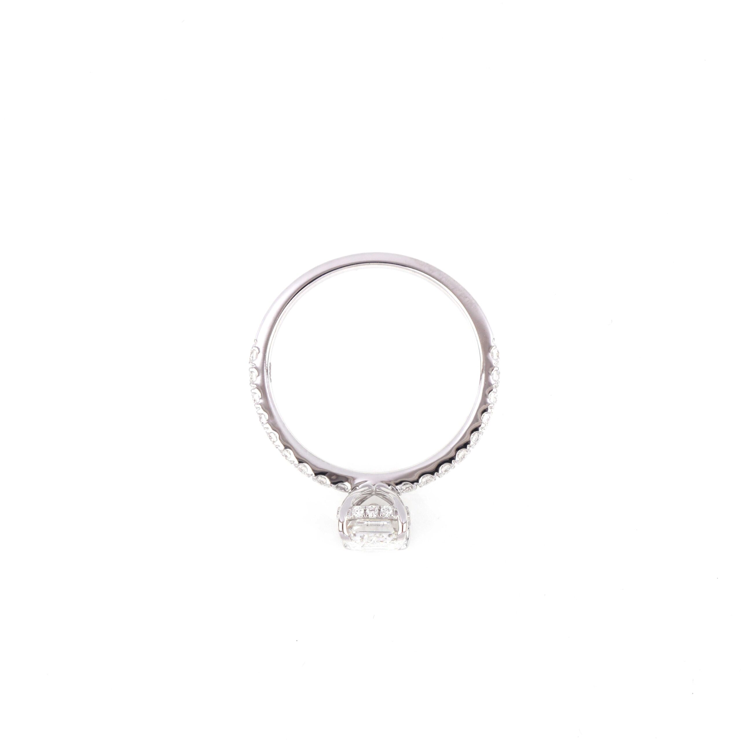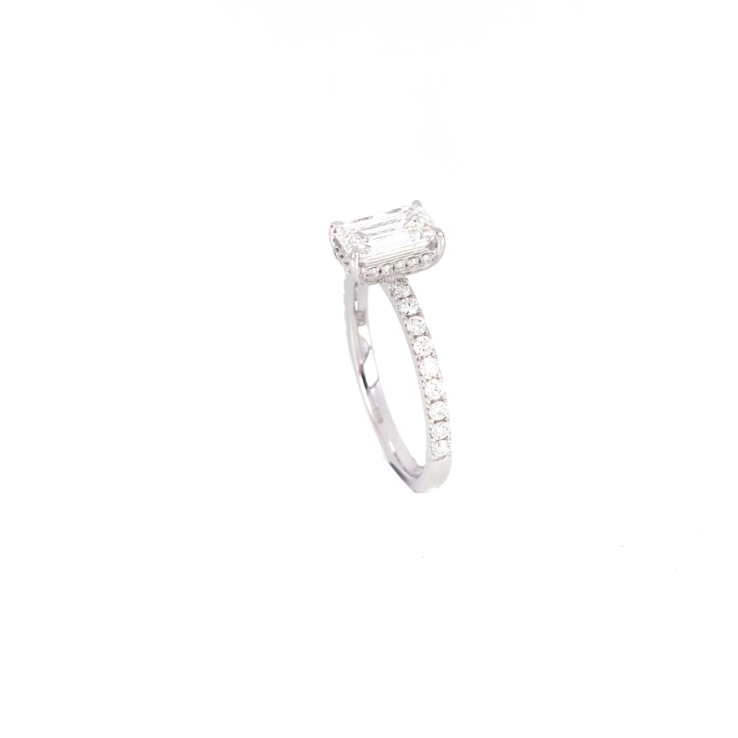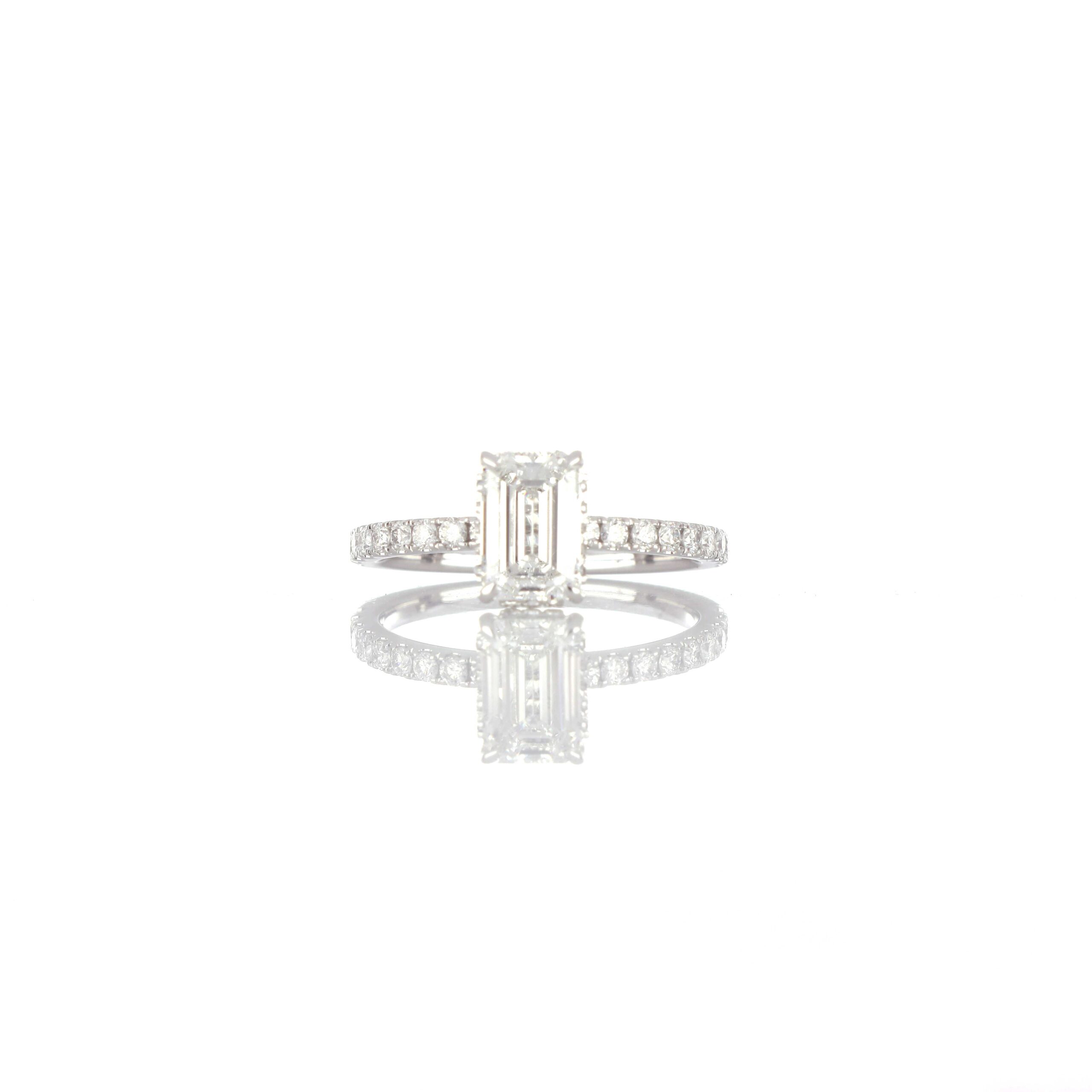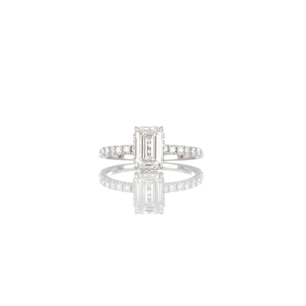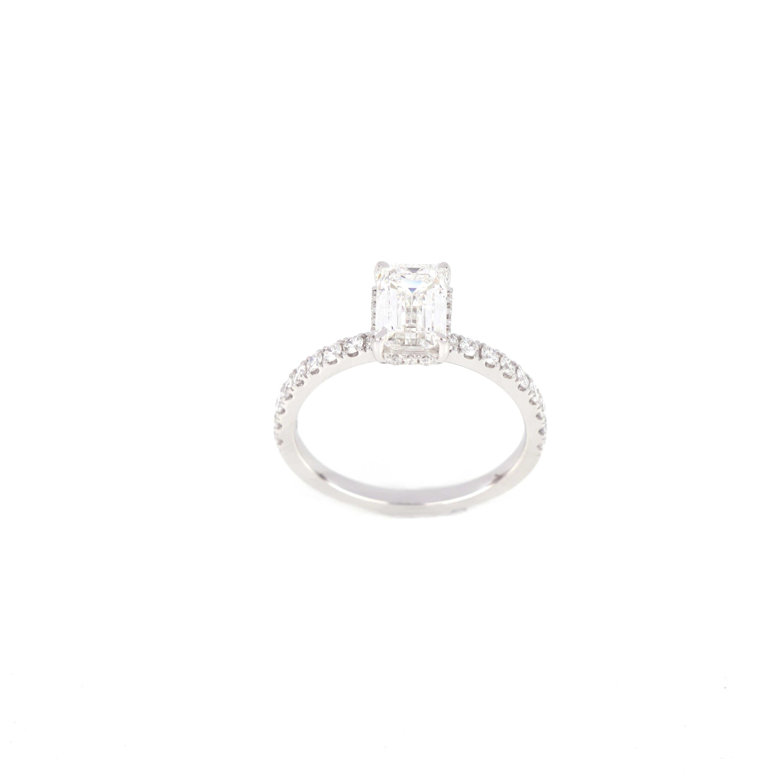 This chic and timeless ring boasts a clean emerald-cut centerpiece and a shimmering band of diamonds for added brilliance. With its balanced proportions and radiant sparkle, it’s a perfect blend of simplicity and sophistication.
