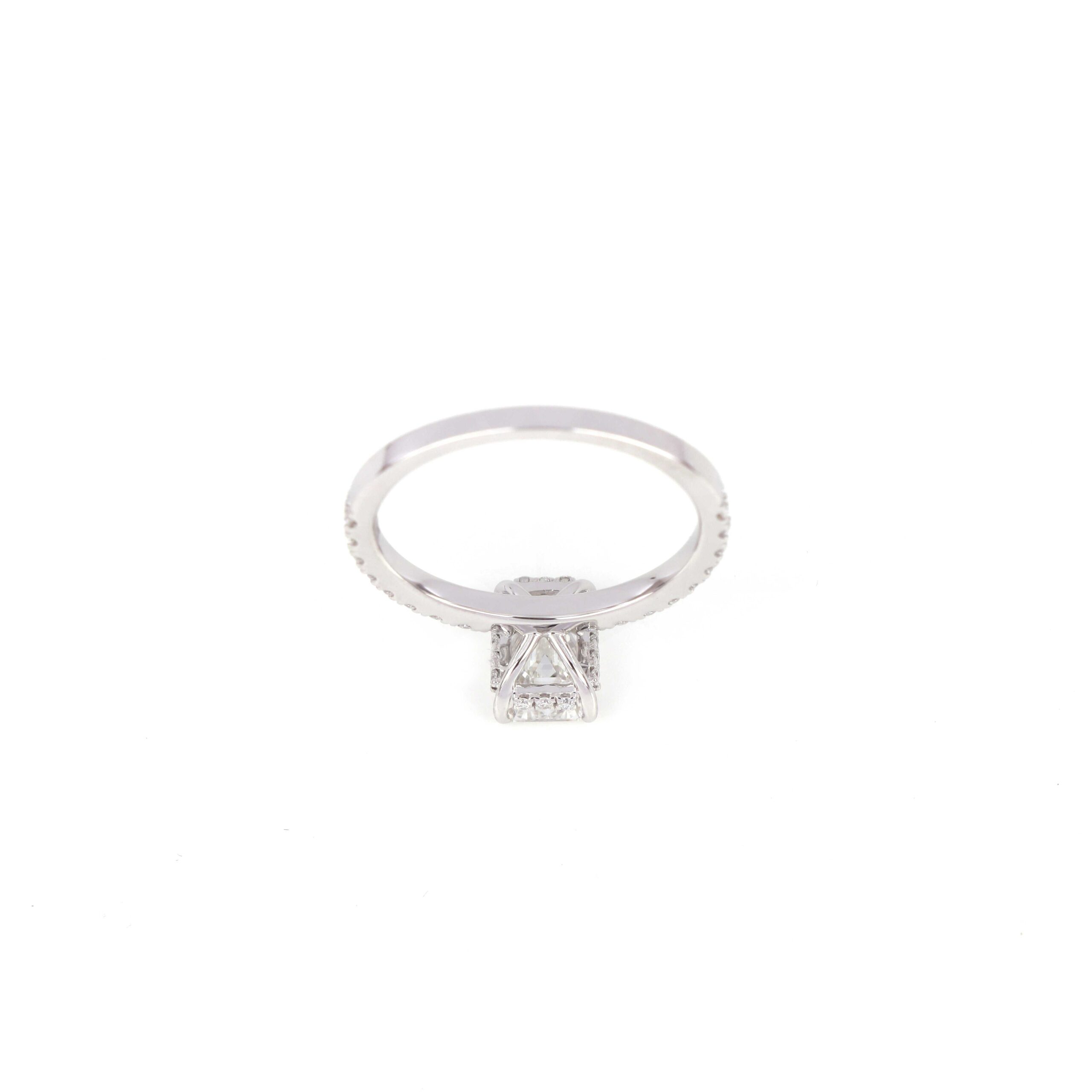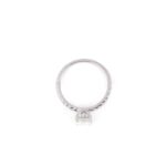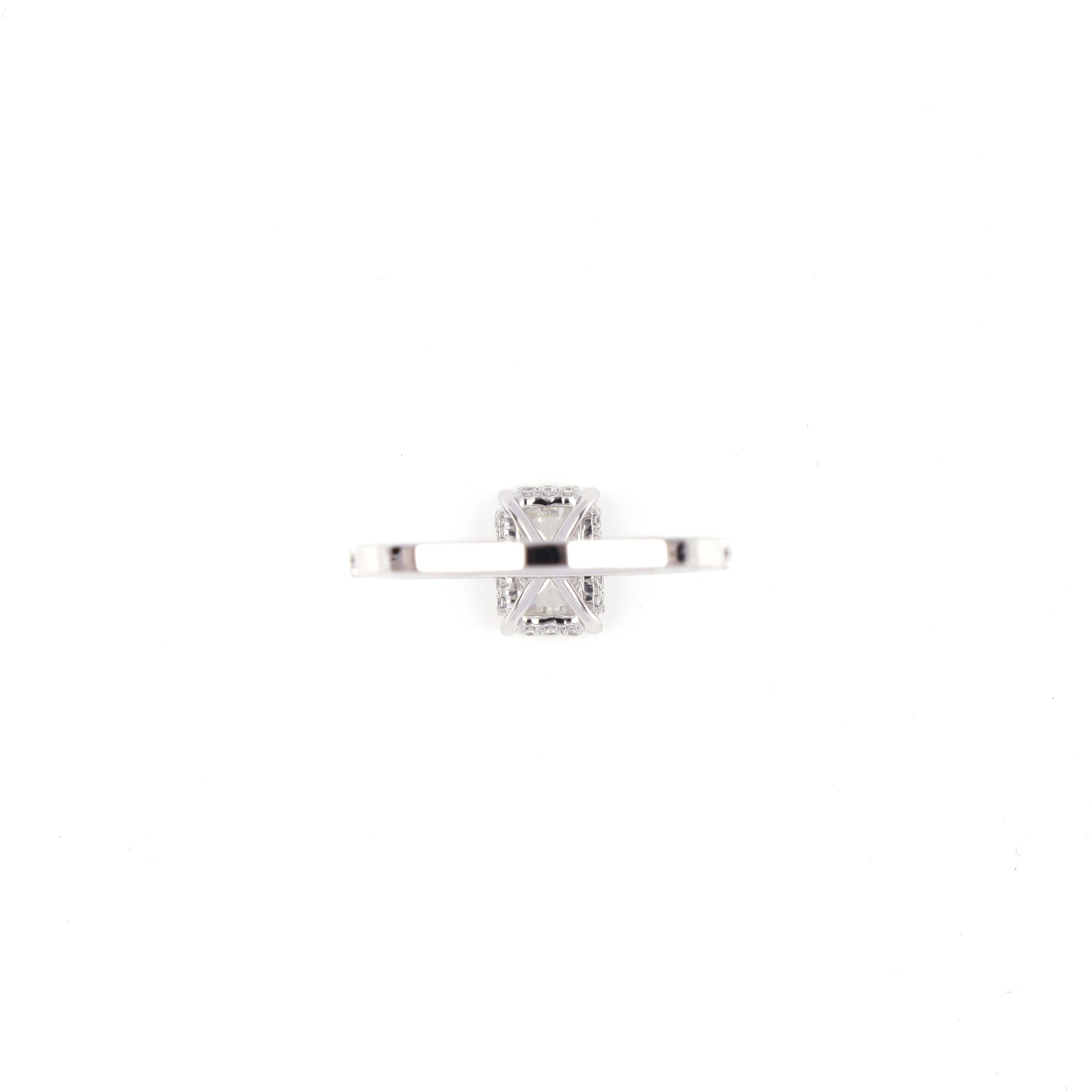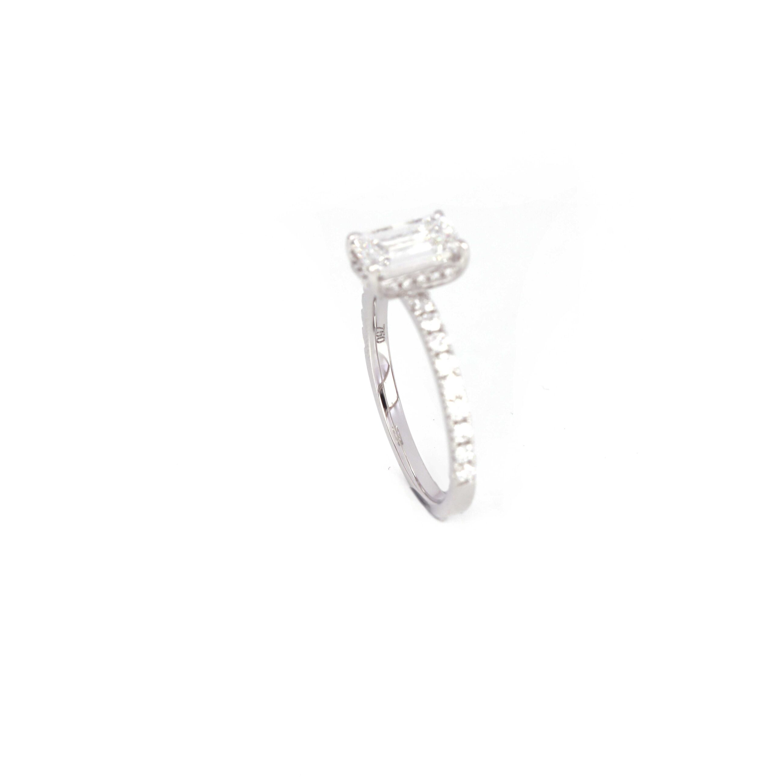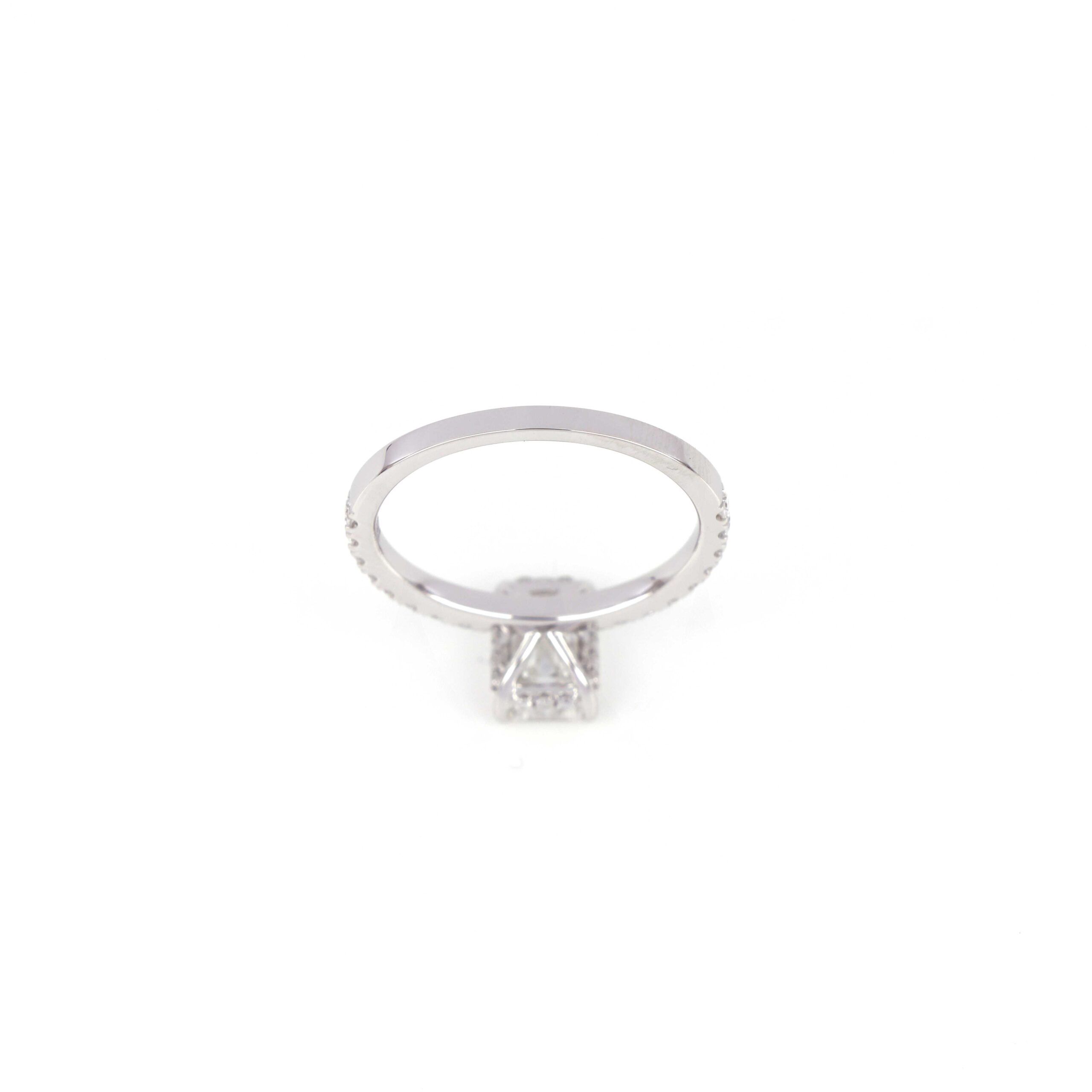 This chic and timeless ring boasts a clean emerald-cut centerpiece and a shimmering band of diamonds for added brilliance. With its balanced proportions and radiant sparkle, it’s a perfect blend of simplicity and sophistication.