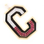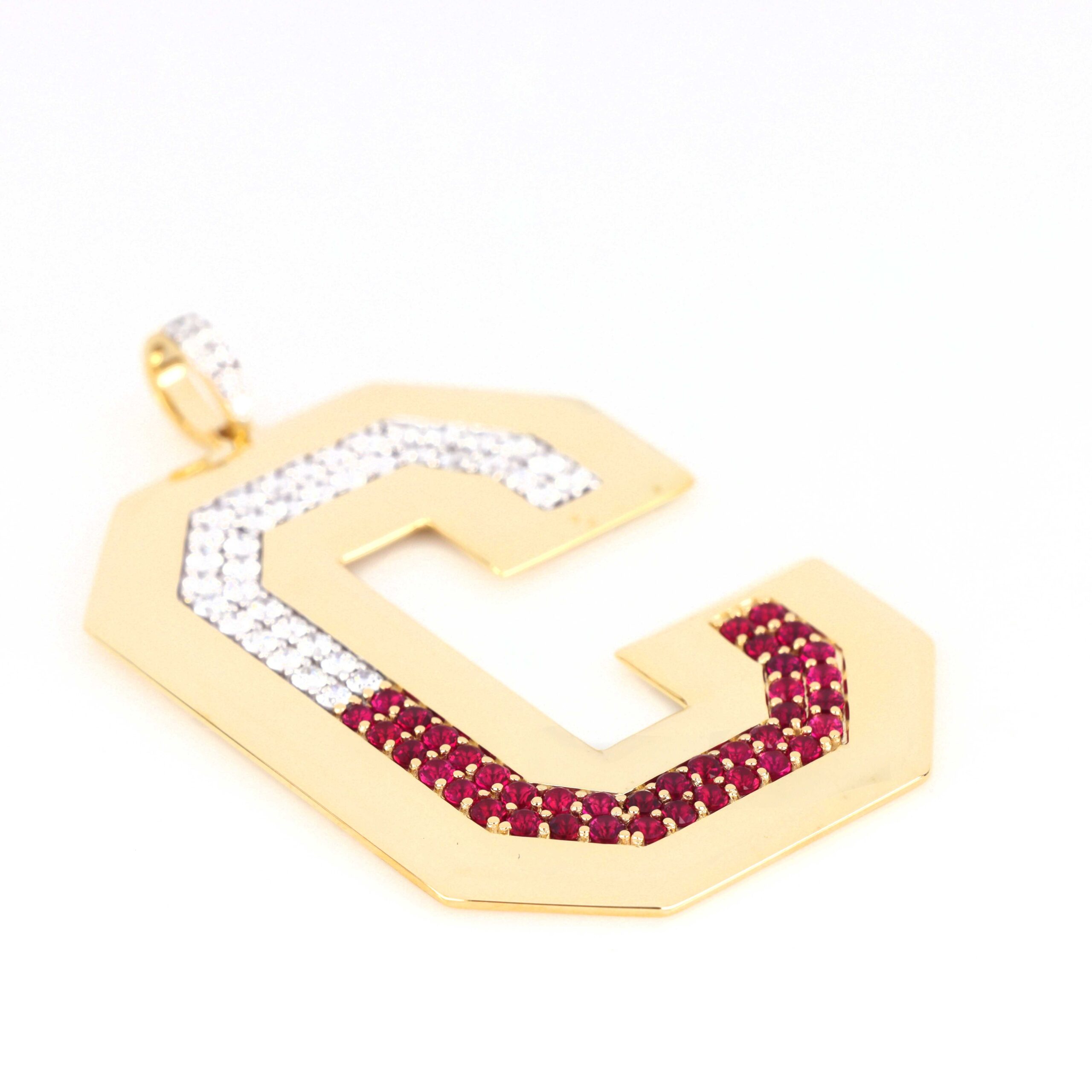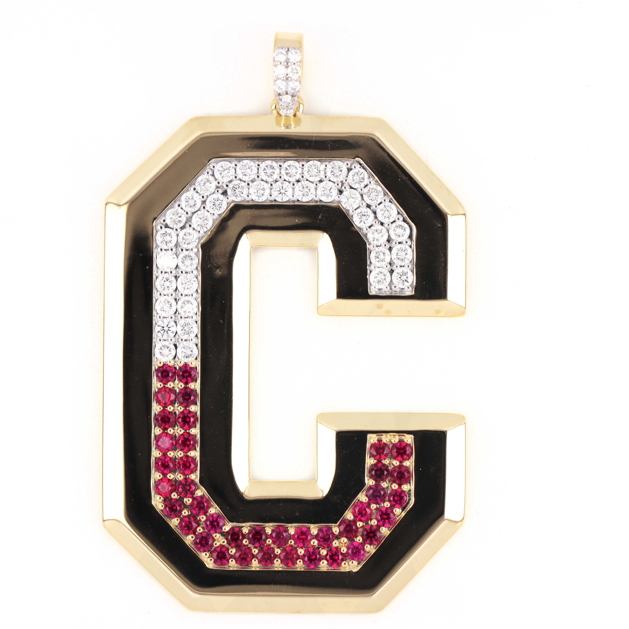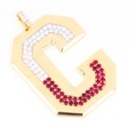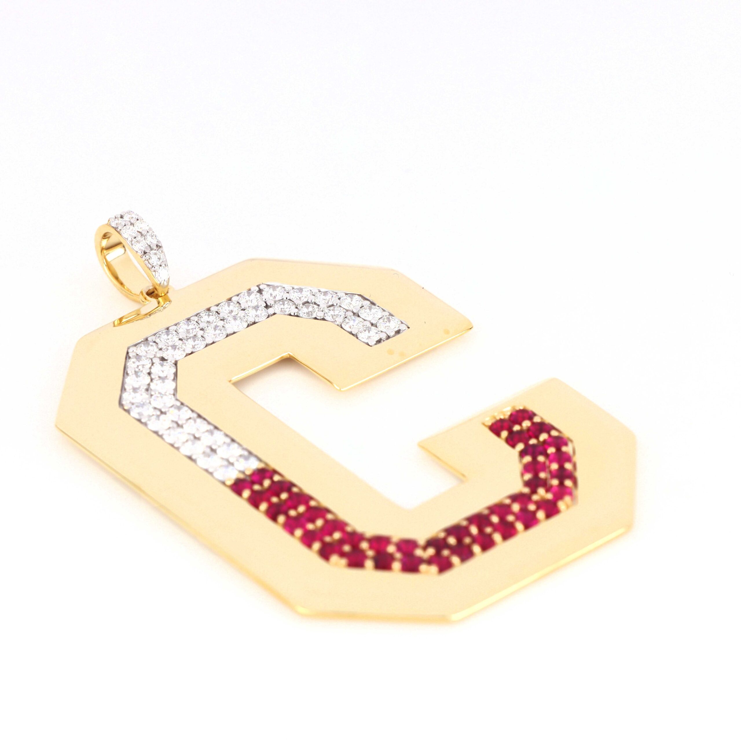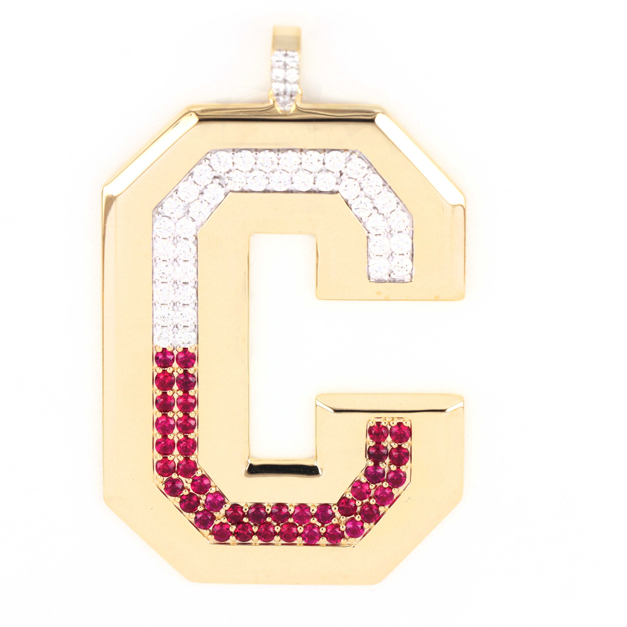 Make a bold statement with this custom initial “C” pendant crafted in luxurious yellow gold. The upper half of the pendant is encrusted with brilliant white diamonds, while vivid red rubies accentuate the lower portion, adding a striking contrast. Ideal as a personalized gift or a standout piece for everyday wear, this pendant blends elegance with individuality.