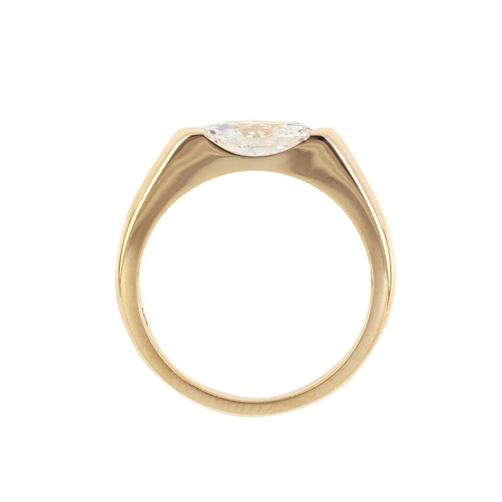 This sleek dome ring offers a modern twist on elegance, featuring a bezel-set stone embedded in a smooth, sculpted band. Its bold yet minimalist design makes it a perfect statement piece for daily wear or refined events. The high-polish finish enhances its contemporary feel.