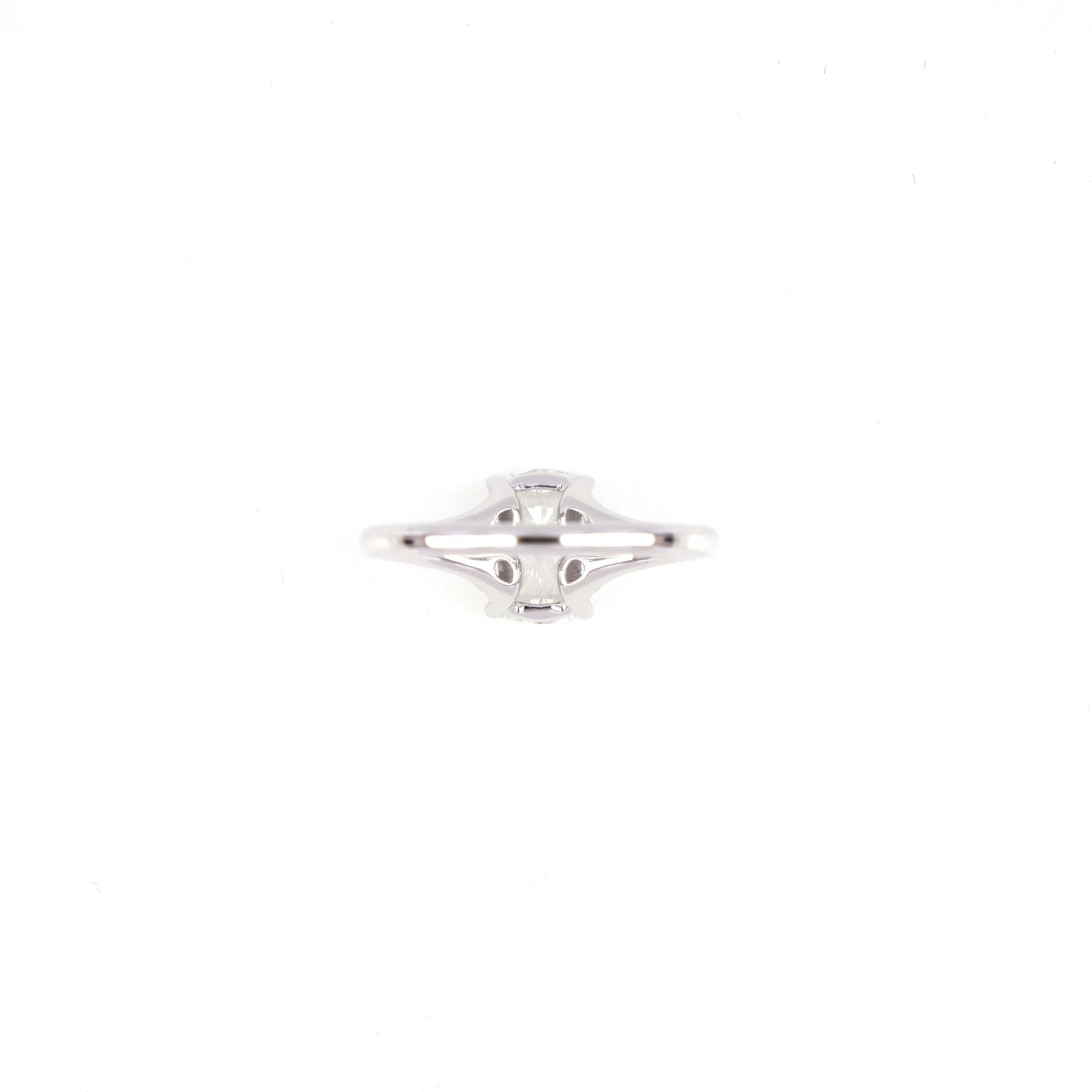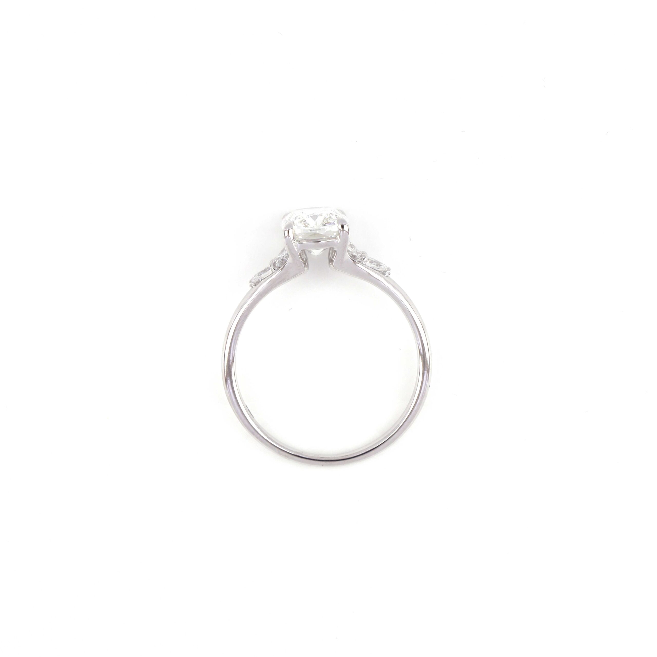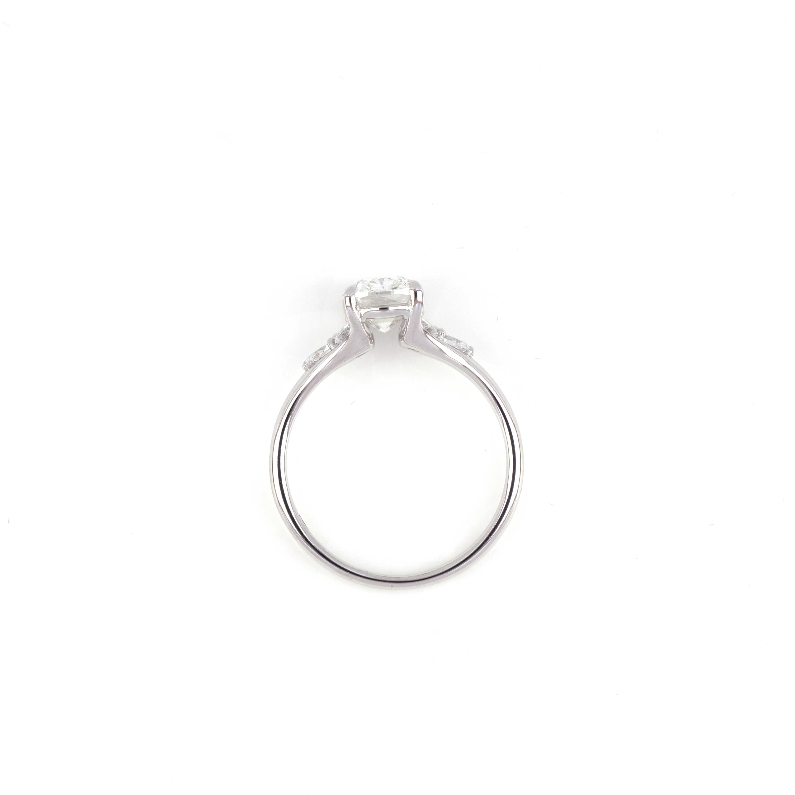 A graceful design, this classic engagement ring showcases a central round brilliant diamond elevated in a secure four-prong setting. The tapered shoulders feature baguette-cut side diamonds, drawing the eye toward the center stone. Crafted in polished white gold, this ring is both timeless and modern in appeal.