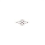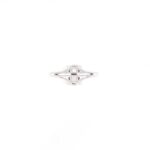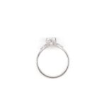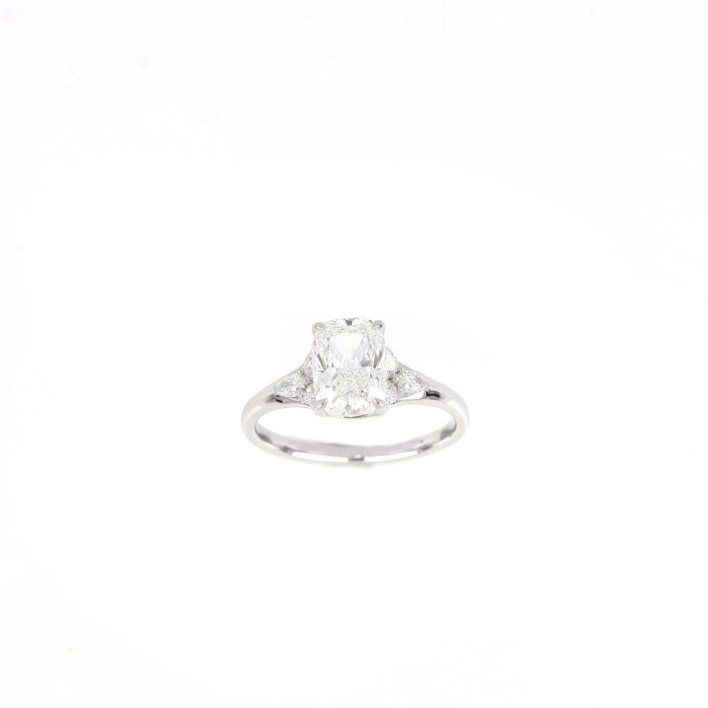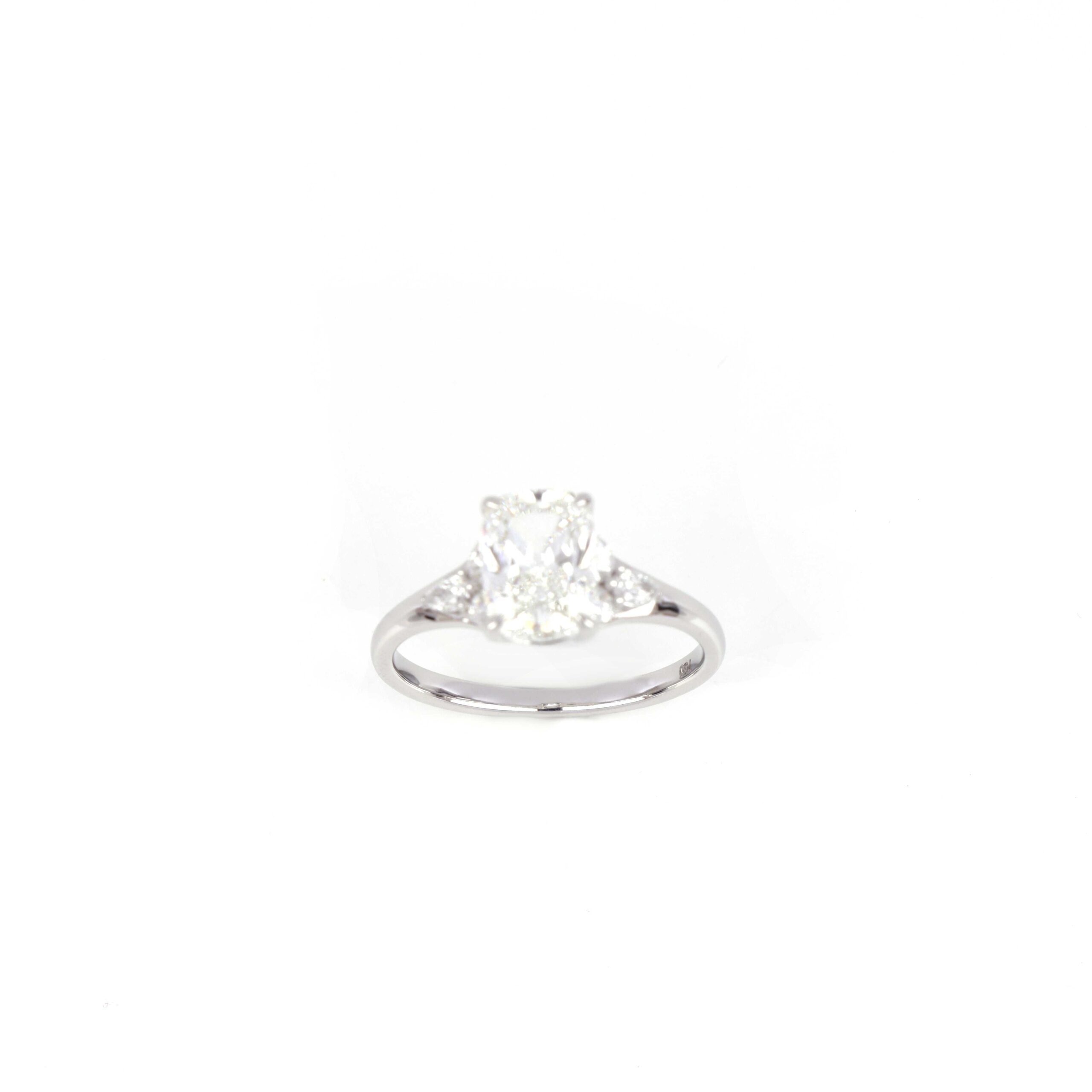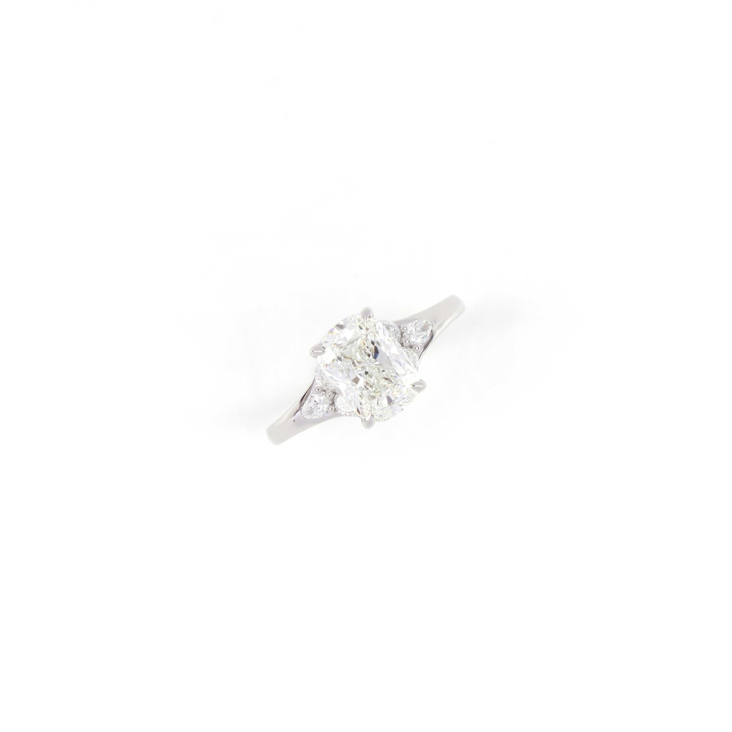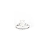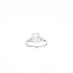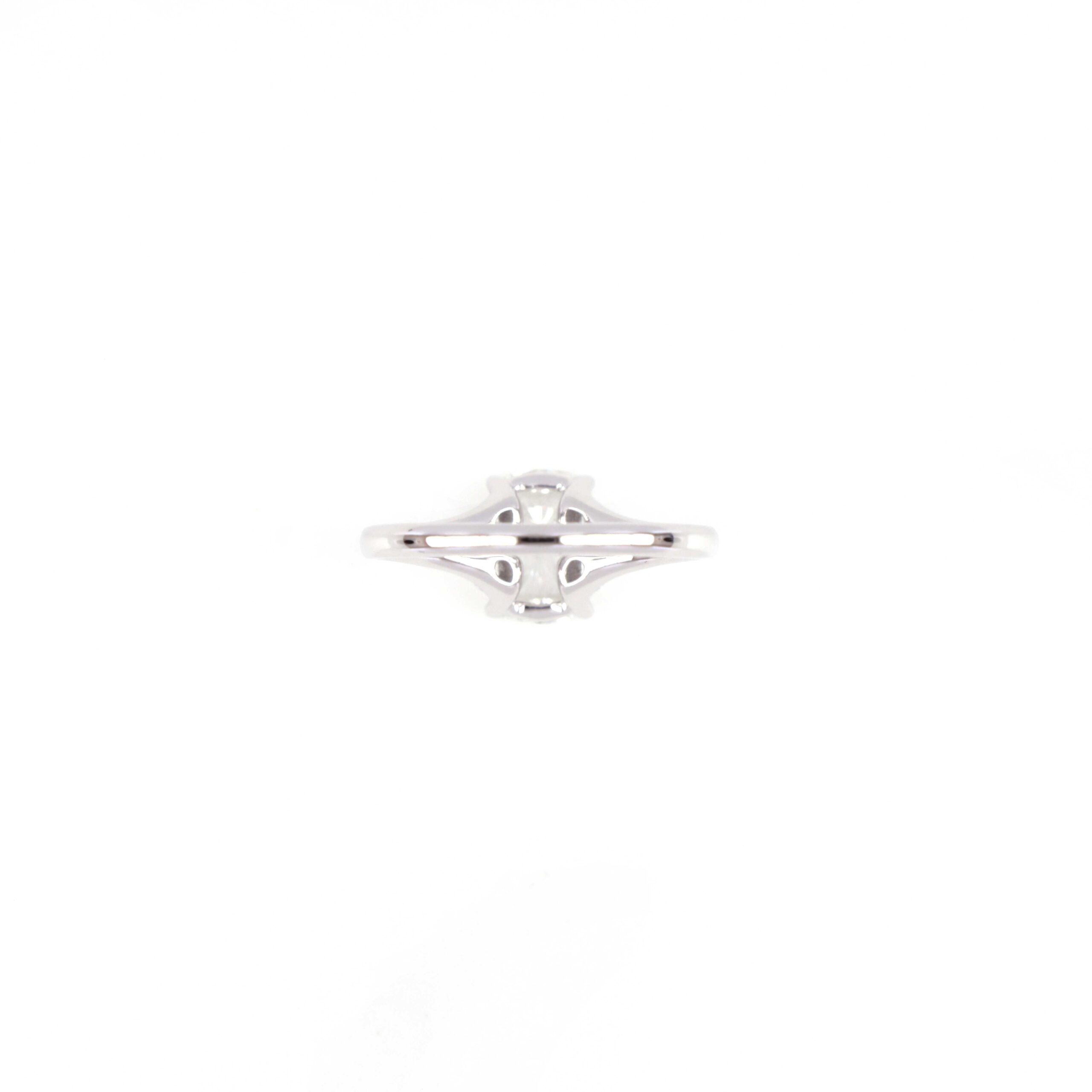 A graceful design, this classic engagement ring showcases a central round brilliant diamond elevated in a secure four-prong setting. The tapered shoulders feature baguette-cut side diamonds, drawing the eye toward the center stone. Crafted in polished white gold, this ring is both timeless and modern in appeal.