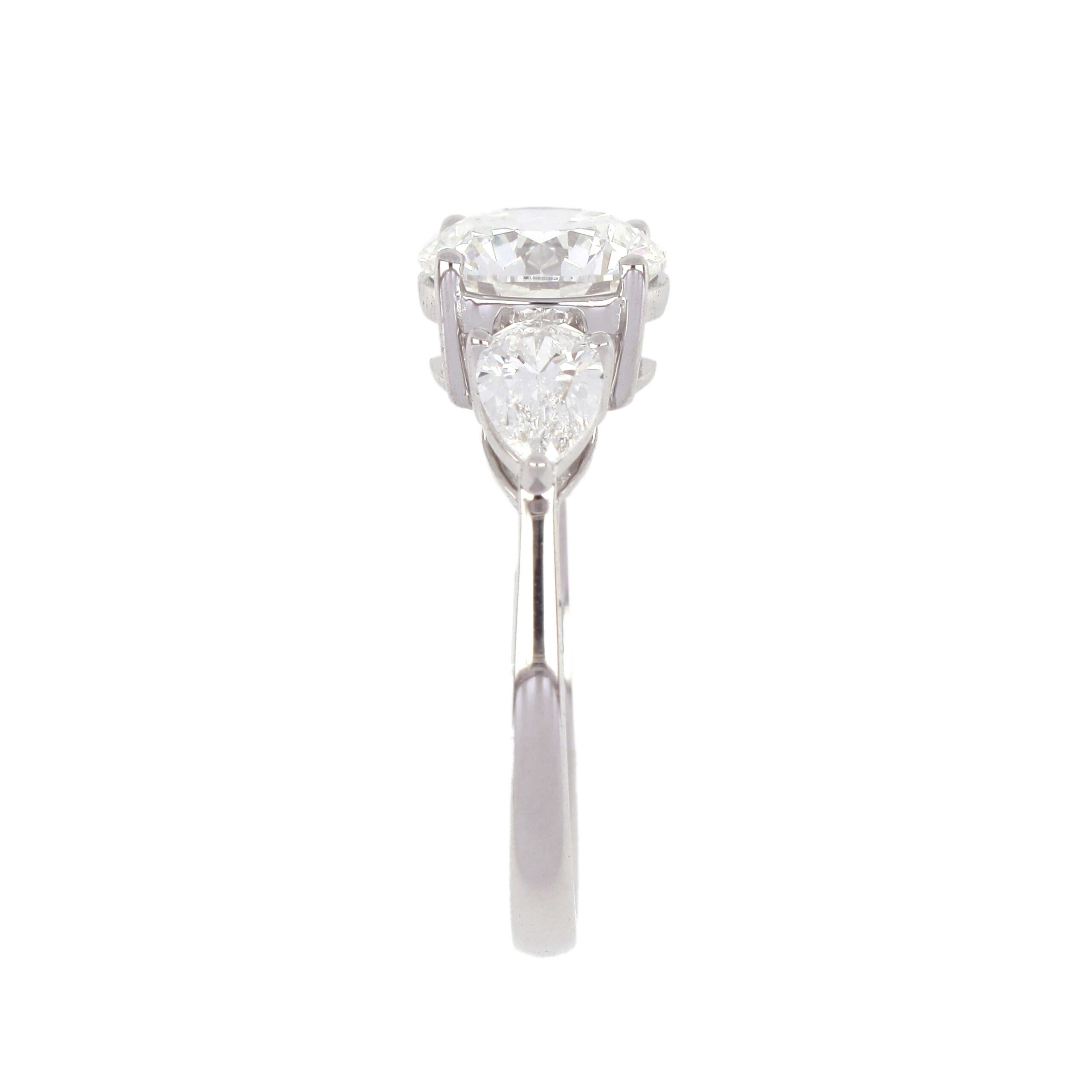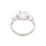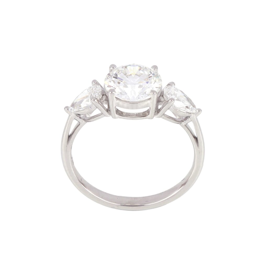 This graceful three-stone ring features a round brilliant-cut center stone flanked by two marquise diamonds, symbolizing past, present, and future. Crafted in white gold, it offers exceptional sparkle and meaning, making it a heartfelt choice for engagements or anniversaries.