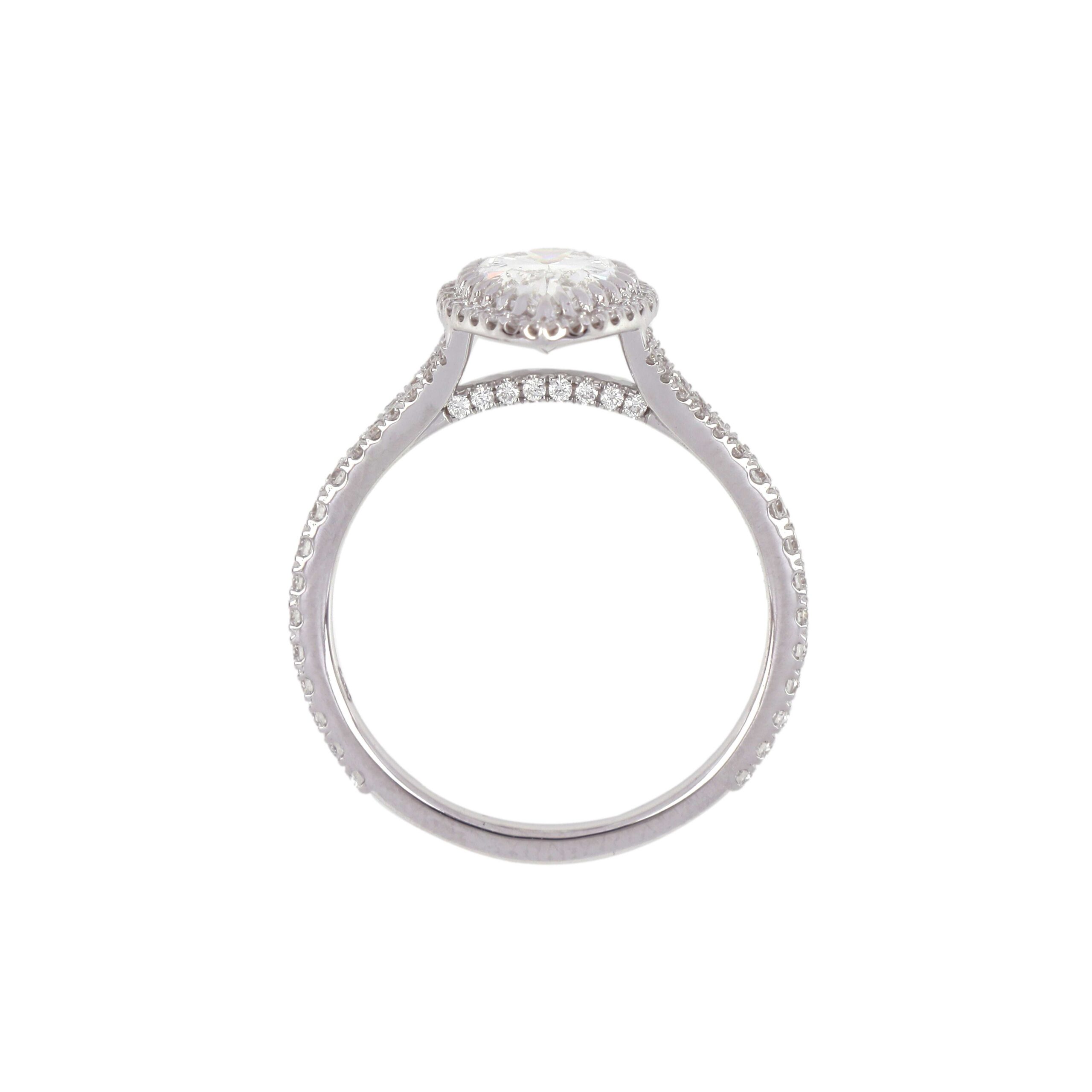 Inspired by timeless romance, this ring boasts a round brilliant center stone surrounded by a scalloped halo and an elegantly detailed band. The side profile sparkles with hidden diamonds, delivering vintage charm with modern brilliance.